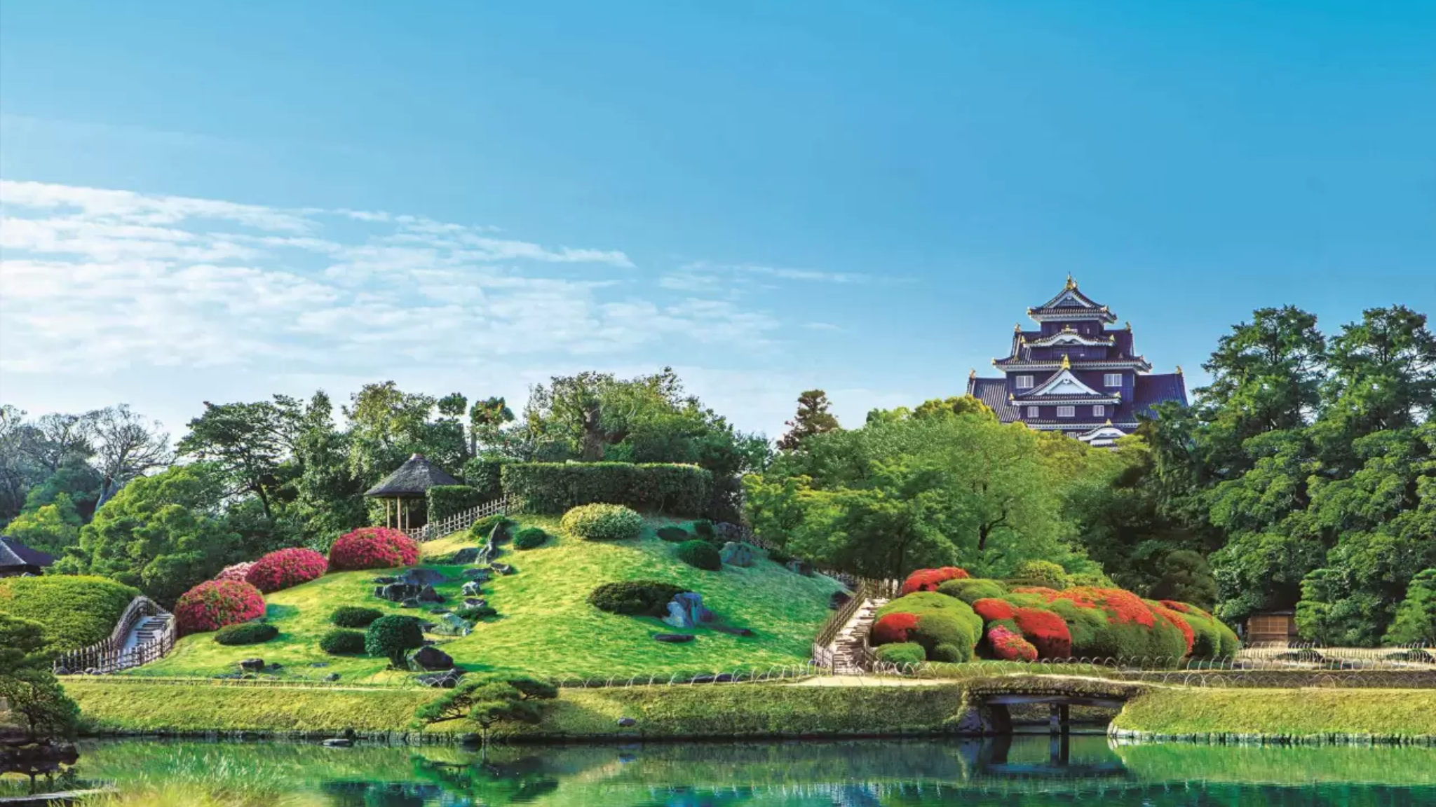 일본 3대 정원의 명성에 걸맞은 단아한 풍경, 옛 번주가 거닐던 비밀스러운 휴식처 고라쿠엔에서 웅장한 오카야마 성을 배경으로 평온한 산책을 즐겨보세요.