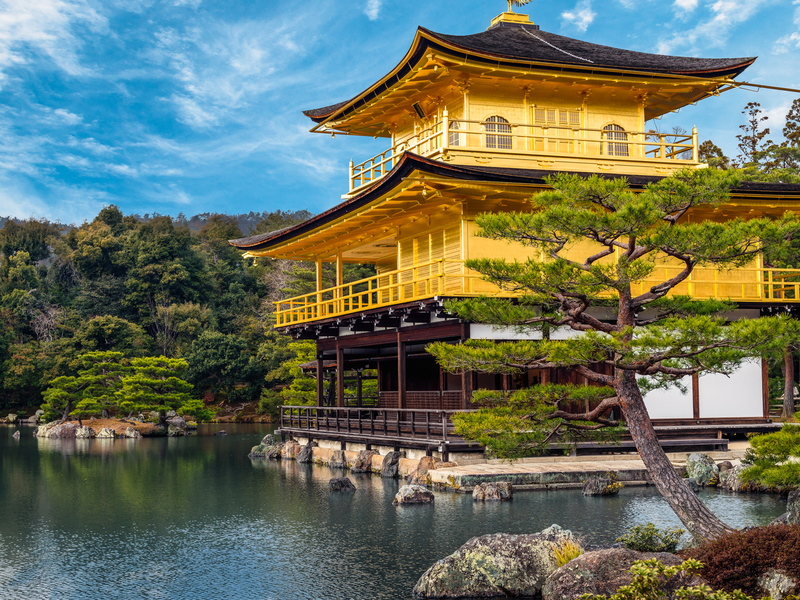 잔잔한 연못 위 눈부시게 피어난 황금빛 별궁, 자연과 금박이 빚어낸 극락정토의 풍경을 금각사에서 직접 마주해 보세요.