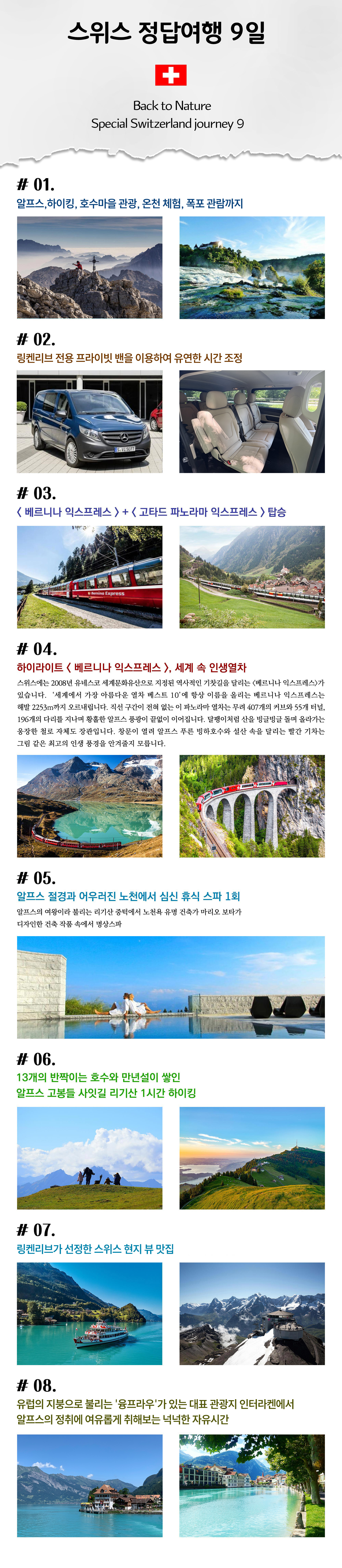 유네스코 세계문화유산으로 지정된 기찻길을 달리는 베르니나 익스프레스. 스위스에서 가장 오래된 도시에서 출발해 마치 달팽이처럼 산을 돌아 지나가며 이탈리아 티라노에 도착한다. 창밖으로 펼쳐지는 빙하의 장엄한 풍경은 여정 내내 눈을 뗄 수 없는 황홀한 절경을 선사한다.