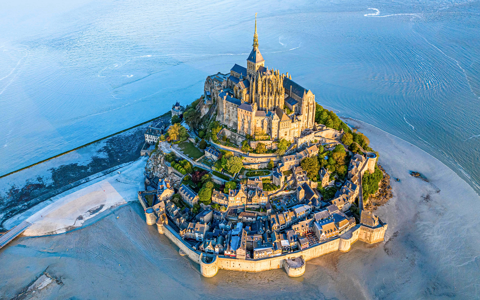 몽생미셸은 노르망디와 브르타뉴 사이 바다 위에 솟은 바위섬으로, 708년 미카엘 대천사의 계시를 받은 주교가 예배당을 세운 것이 시초이며, 966년부터 베네딕토회 수도원이 건립되어 "서양의 경이"로 불리는 중세 건축의 걸작입니다.